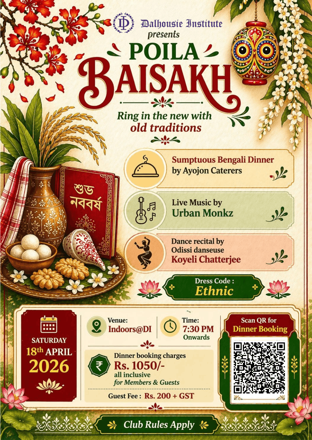On Saturday 18th April, 2026 from 7:30 PM Onwards Special Dinner Menu by Ayojan Caterers Rs 1050.00 all inclusive for Members & Guests